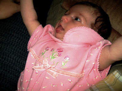 Well, she has finally begun to have "calm awake" time. At first we didn't know what to do with her. She would wake up and start making noise and we would run around trying to make her happy. Then we realized that she was happy just sitting there, making her noises. She is a very noisy baby. Eating has it's sound effects; sleeping has it's sound effects; bathing has it's sound effects; and playing has it's sound effects.